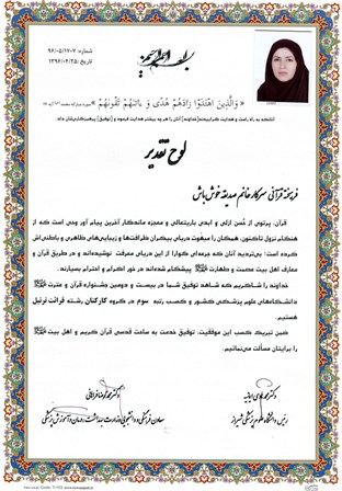 | کسب عنوان برتر جشنواره قرآن و عترت وزارت توسط خانم صدیقه خوش باش همکار محترم شاغل در بخش رادیولوژی بیمارستان | ||