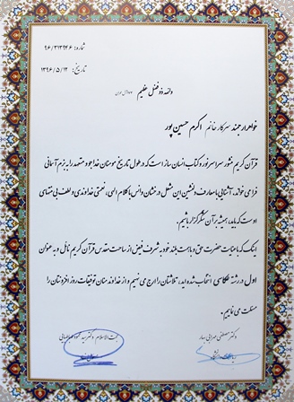 | کسب مقام اول رشته عکاسی در پانزدهمین جشنواره قرآنی دانشگاه علوم پزشکی مشهد توسط سرکار خانم حسین پور همکار محترم اورژانس جراحی | ||