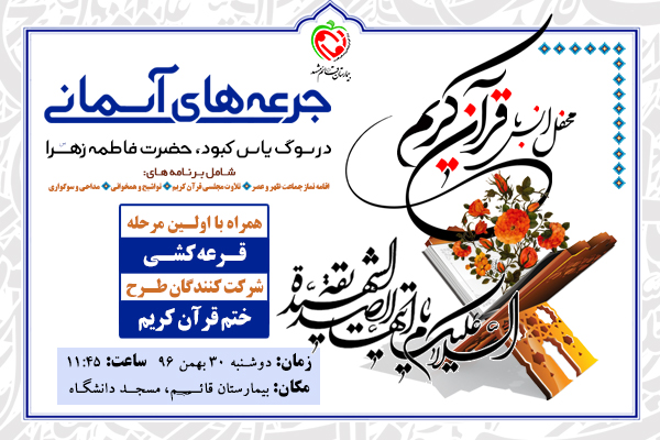 1.خانم آرزو صدیق - پرستار ایمونولوژی-منتخب هدیه هزینه سفر عتبات عالیات 2.خانم زهره افخمیان - پرستار داخلی سه-منتخب هدیه نقدی 3.خانم فاطمه فیروزیان - واحد کارگزینی. 4.خانم خدیجه خادم . واحد آمار 5.خانم الهه حسین پور طوسی - پرستار اتاق عمل 6.خانم ناهید حسن نیا - پرستار جراحی اعصاب 7.خانم زهرا گلچیان - کمک بهیار سی سی یو بزرگسالان به اطلاع همکاران محترم می رساند:ان شاءلله در پایان برنامه ختم روزانه قران کریم مرحله ی دوم قرعه کشی به تعداد6هدیه نقدی و1 سفر عتبات عالیات نیز در برنامه محفل انس با قران کریم انجام خواهد شد. |