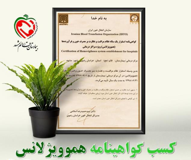 با تلاش و همت مسئولین، همکاران بانک خون و واحد آموزش سلامت کارکنان، بیمارستان قائم(عج) موفق به اخذ گواهينامه هموويژلانس از سازمان انتقال خون ايران گرديد. تزریق خون و فرآورده های خونی مانند پلاکت در بیمارستان ها یک امر اجتناب ناپذیر است به گونه ای که گاهی حفظ جان بیمار بسته به دریافت کیسه ای و یا چند سی سی خون می باشد. از آن جایی که خون یک بافت زنده بوده و تزریق بدون دقت آن به بیمار نیازمند خون، به جای حل مشکل بیمار برای وی خطر آفرین است، ضرورت وجود یک سازوکار نظارتی دقیق بر این فرایند حس می شد. از این رو در سراسر جهان سیستمی نظارتی به صورت یک پارچه ، زیر نظر سازمان انتقال خون هر کشور به نام "هموویژلانس " شکل گرفت تا با کنترلی دقیق خطر بروز عوارض خطرناک را به صفر و عوارض سطحی تر را به حداقل ممکن برساند. در واقع هموویژلانس عبارت است از یک سیستم نظارت بر تزریق خون و فراورده های خونی، برای کنترل بیشتر عوارض جانبی و حفظ سلامت بیمار. این سازوکار از خود سازمان انتقال خون که وظیفه ی جمع آوری و فراوری خون های اهدایی را بر عهده دارد آغاز شده و مسیر انتقال خون تا بیمارستان ها ، بانک خون هر بیمارستان ، نحوه ی تجویز خون ، ارسال به بالین بیمار و درنهایت تزریق به بیمار راشامل می گردد. همچنین بررسی دقیق بیمار نیازمند خون قبل از تزریق ، حین تزریق و بعد از دریافت خون ( یا سایر فرآورده های خونی ) جزء این فرایند نظارتی محسوب می گردد. این سیستم به گونه ایست که تمام مراحل کاری آن در فرم های استاندارد و ویژه ای که مربوط به هر مرحله از کار می شود ، توسط پزشک یا پرستار ثبت شده و عوارض احتمالی نیز به سازمان انتقال خون گزارش می گردد. همه ی کارکنان درمانی هر بیمارستانی که این سیستم را داراست آموزش های لازم را دیده و پزشک ارشد هموویژلانس ، جانشین وی و مسؤول بانک خون بر صحت اجرای آن نظارت داشته و با سازمان انتقال خون استان در ارتباط می باشند. اهدای خون اهدای زندگیست به شرطی که با دقت و نظارت دقیق انجام پذیرد. |