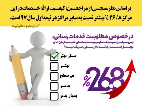 اخبار 21 آذر 1397 21 آذر 1397 بازدید: 518 امتیاز: ( 0 Rating ) براساس نظرسنجی از مراجعین، کیفیت ارائه خدمات در این مرکز 26/8 درصد بیشتر نسبت به سایر مراکز درنیمه اول سال 97 است. امتیاز کاربران لطفا رای دهید رای 1 رای 2 رای 3 رای 4 رای 5 قبلی بعدی