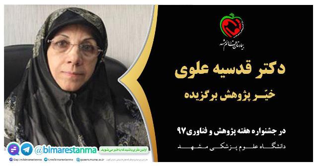 | کسب رتبه "خیّر پژوهش برگزیده" در جشنواره هفته پژوهش و فناوری97 دانشگاه علوم پزشکی مشهد توسط دکتر قدسیه علوی، استاد و جراح متخصص زنان و مامایی بازنشسته بیمارستان قائم(عج) |