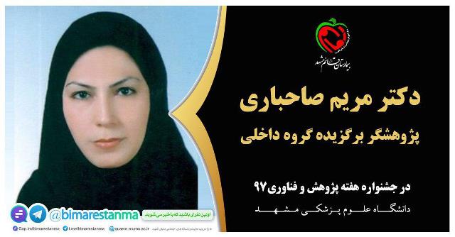 کسب عنوان "پژوهشگر برگزیده گروه داخلی" در جشنواره هفته پژوهش و فناوری97 توسط دکتر مریم صاحباری، دانشیار محترم گروه داخلی بیمارستان قائم(عج) |
