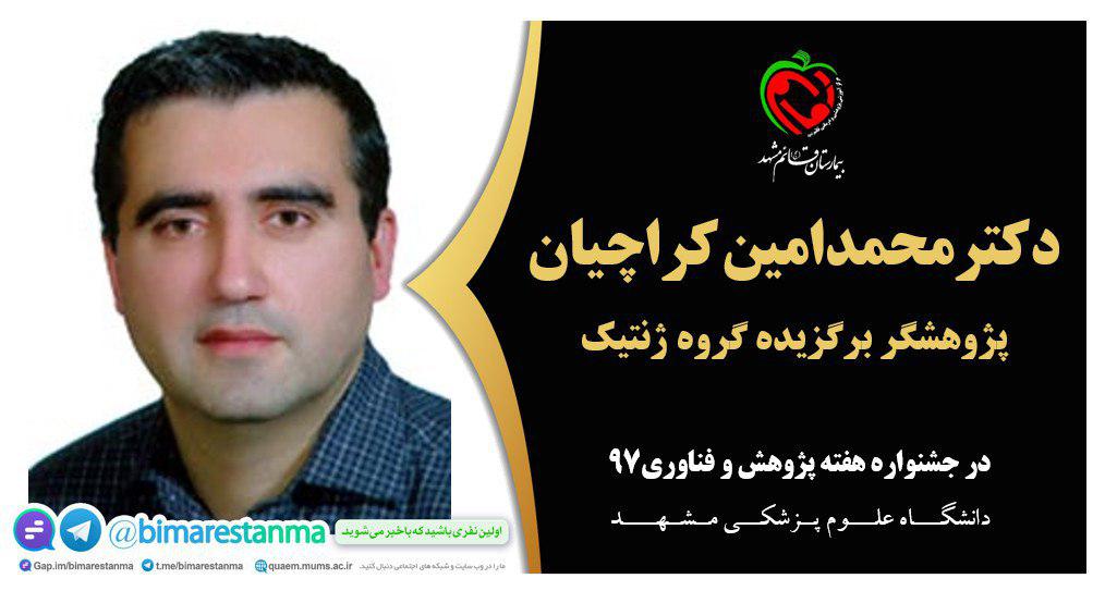 کسب عنوان "پژوهشگر برگزیده گروه ژنتیک" در جشنواره هفته پژوهش و فناوری97 دانشگاه علوم پزشکی مشهد توسط دکتر محمدامین کراچیان، استادیار محترم گروه ژنتیک بیمارستان قائم(عج) |
