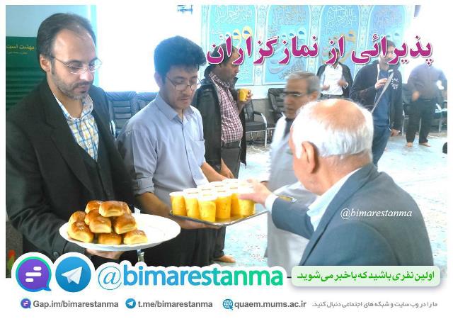 به مناسبت ولادت حضرت فاطمه زهرا (س) و روز زن از نمازگزاران حاضر در مسجد بیمارستان با شیر و شیرینی پذیرائی شد. با سپاس از بانیان این امر، کسبه و بازاریان صنف موبایل خیابان احمدآباد که همه روزه نیز حضور گرمی در برپائی نمازهای جماعت مسجد دارند. |
