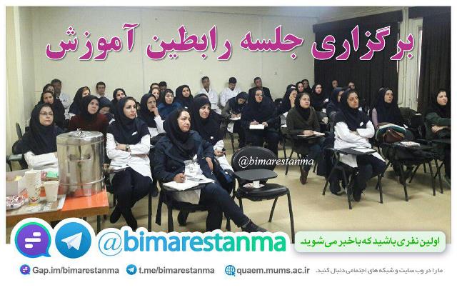 موارد مورد بررسی در جلسه: ۱.تاکید مترون مرکز بر اهمیت آموزش به بیمار، پیشگیری از زخم و سقوط از تخت، که دستیابی به آن باعث ارتقاء رضایتمندی بیماران و همراهیان خواهد بود. ۲.تاکید سوپروایزر آموزش بر ارزیابی اولیه نیروهای جدیدالورود. ۳.تاکید سوپروایزر آموزش سلامت بر حضور همراهیان بیمار در کلینیکهای آموزش سلامت و آموزش به موقع و مطلوب به همراه ارتباط موثر با بیمار و خانواده ۴.تقدیر از بخشها ورابطین آموزشی نمونه سال۹۷ |