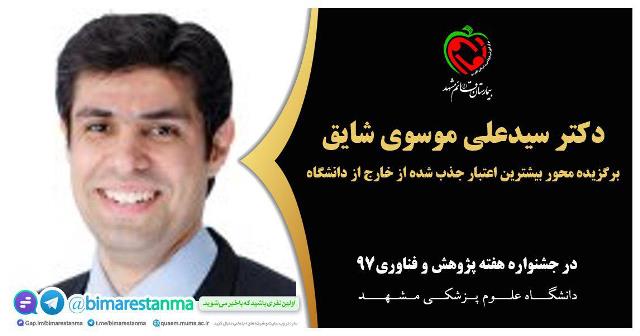 کسب عنوان "برگزیده محور بیشترین اعتبار جذب شده از خارج از دانشگاه" در جشنواره هفته پژوهش و فناوری97 دانشگاه علوم پزشکی مشهد توسط دکتر سیدعلی موسوی شایق، استادیار محترم مرکز تحقیقات جراحی ارتوپدی و تروما بیمارستان قائم(عج) |