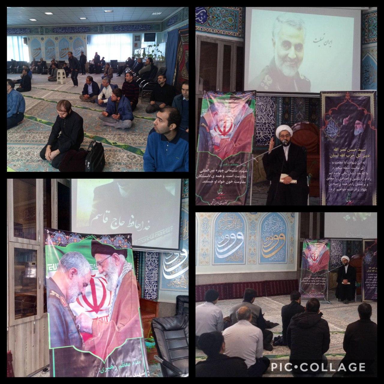 مراسم گرامیداشت شهادت سردار دلها حاج قاسم سلیمانی امروز همزمان با اقامه نماز ظهر و عصر با نوحه سرایی ذاكرين اهلبيت و سخنراني حجت السلام دكتر بنكدار نماينده دفتر نهاد مقام معظم رهبري مستقر در مركز و جمع کثیری از برادران و خواهران ولایتمدار در مسجد دانشگاه برگزار شد .