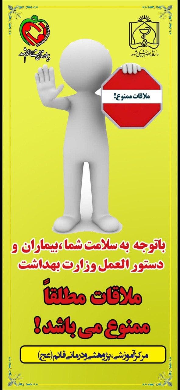 به استناد مصوبه کمیته کنترل عفونت بیمارستان و به منظور تامین سلامت بیماران بستری و مراجعین محترم، ملاقات حضوری بیماران تا اطلاع ثانوی ممنوع می باشد.از همه مردم شریف و مراجعین گرامی خواهشمندیم که در راستای حفظ سلامت جامعه و مخصوصاً بیماران بستری، از مراجعه به بیمارستان ها و اصرار جهت ملاقات با بیماران خودداری نمایند.از اینکه ما را در جهت ارائه خدمت بهتر به بیماران یاری می کنید بسیار سپاسگزاریم.