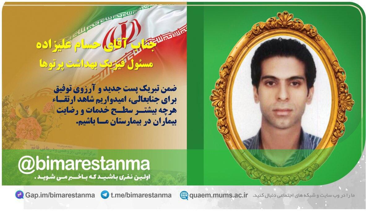 جناب آقای حسام علیزاده با حفظ سمت پست جدید شما را به عنوان مسئول بهداشت پرتوها #بیمارستان_ما