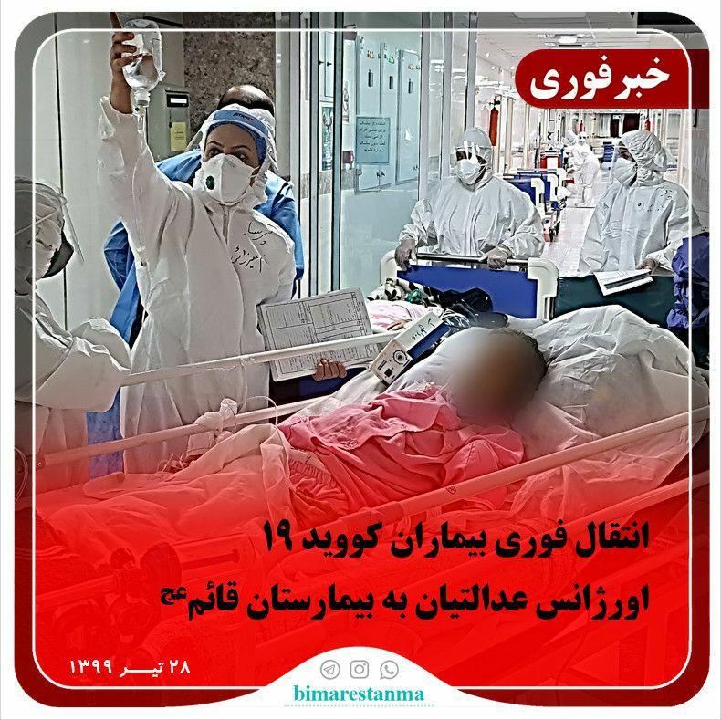 🔺با توجه به افزایش بیش از حد مراجعه بیماران کووید 19 به اورژانس عدالتیان و اعلام معاونت محترم درمان دانشگاه، مبنی بر کمک رسانی به این اورژانس حسب دستور معاونت محترم درمان، تا لحظه انتشار خبر ۳۰ بیمار کووید 19 در اورژانس بیمارستان قائم عج پذیرش شد.