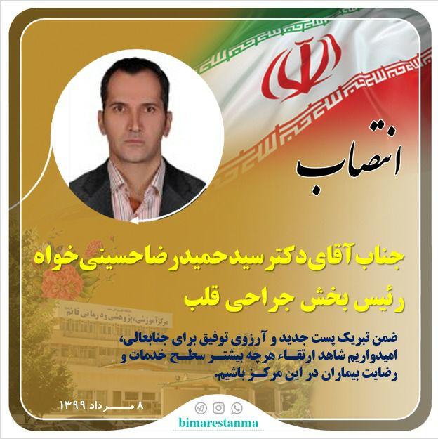 جناب آقای دکتر سیدحمیدرضا حسینی خواه، عضو محترم هیئت علمی #بیمارستان_ما انتصاب جنابعالي را بعنوان رئیس بخش جراحی قلب تبریک مي گوئيم.