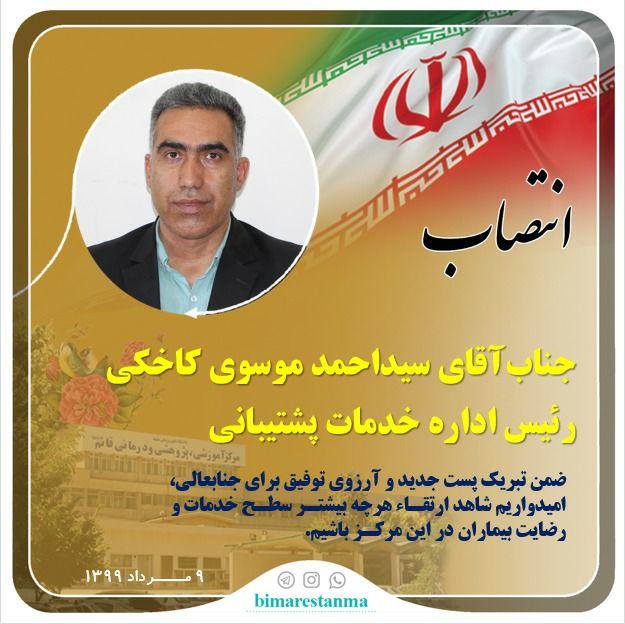 جناب آقای سید احمد موسوی کاخکی، انتصاب جنابعالي را بعنوان رئیس اداره خدمات پشتیبانی #بیمارستان_ما تبریک مي گوئيم.