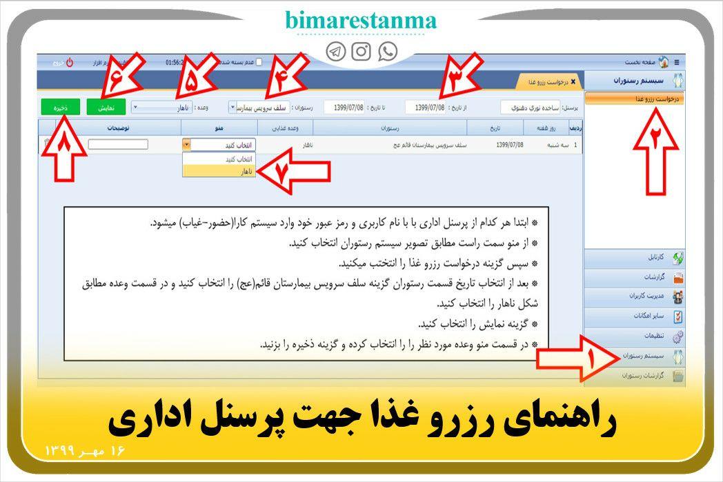 * بعد از انتخاب تاریخ، در قسمت رستوران گزینه سلف سرویس بیمارستان قائم(عج) را انتخاب کنید و در قسمت وعده، ناهار را انتخاب نمایید.