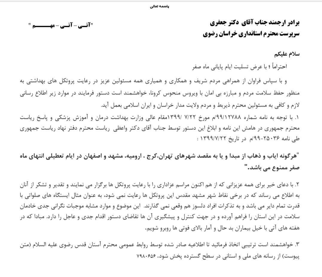 بر اساس دستور ستاد ملی کرونا و تاکید وزارت بهداشت درمان و آموزش پزشکی "هرگونه ایاب و ذهاب از مبدا و یا به مقصد شهرهای تهران،کرج ، ارومیه، مشهد و اصفهان در ایام تعطیلی انتهای ماه صفر ممنوع است".