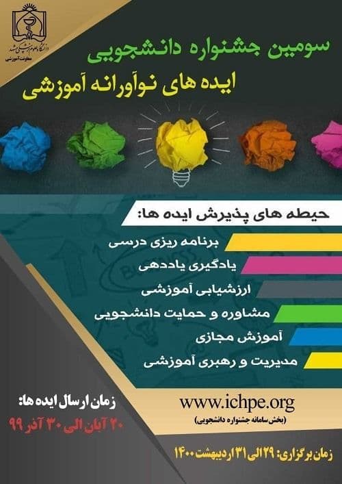 🔶️سومین جشنواره دانشجویی ایده های نوآورانه آموزشی با هدف تقویت حضور و مشارکت دانشجویان در تحول و نوآوری در آموزش علوم پزشکی و با هدف نهادینه سازی فعالیت های هدفمند، آگاهانه و روش مند در زمینه توسعه و تعالی آموزش علوم پزشکی، همزمان با بیست و دومین همایش کشوری آموزش علوم پزشکی و چهاردهمین جشنواره کشوری شهید مطهری در روزهای 29 لغایت 31 اردیبهشت 1400 در دانشگاه علوم پزشکی شیراز برگزار خواهد شد. 🔶️دانشجویان علاقمند به مقوله های نوآوری آموزشی جهت دريافت فايل راهنماي نحوه نگارش ايده نوآورانه و ثبت نام می توانند تا 30 آذر ماه سال جاري با مراجعه به سايت رسمي جشنواره https://ichpe.org/sfimed-2/ |