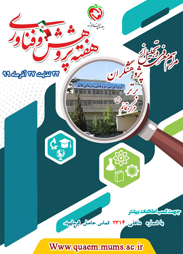 مرکز آموزشی، پژوهشی و درمانی قائم (عج)، در نظر دارد به منظور شناسایی و تجلیل از پرسنل و پزشکان غیر هیات علمی فعال در حوزه پژوهش و فعالیتهای علمی، در هفته پژوهش و فناوری اقدام به انتخاب پژوهشگران برگزیده نماید. لذا از همکاران محترم علاقمند تقاضا میگردد، تمامی مدارک و مستندات خود را حداکثر تا پایان هفته دوم آذر ماه 1399 به آدرس پست الکترونیک زیر ارسال نمایند. این آدرس ایمیل توسط spambots حفاظت می شود. برای دیدن شما نیاز به جاوا اسکریپت دارید