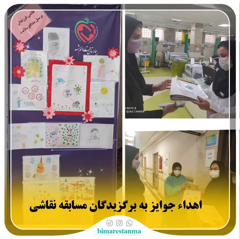 🔸تقدیر از نفرات برتر مسابقه نقاشی فرزندان مدافعان سلامت با حضور مترون مرکز و جمعی از سوپروایزران محترم برگزار شد. 🔺خانم نجمه مرشدلو فرزند خانم رحمانی icu کووید 🙏با سپاس از سوروایزر مهربان و دلسوز آموزش سلامت جهت تهیه جوایز و برنامه تشویقی فرزندان مدافعین سلامت و سپاس از فرزندان عزیز همکاران خوب و پرتلاشمان که ما را در برگزاری نمایشگاه نقاشی در هفته سلامت یاری کردند.  |