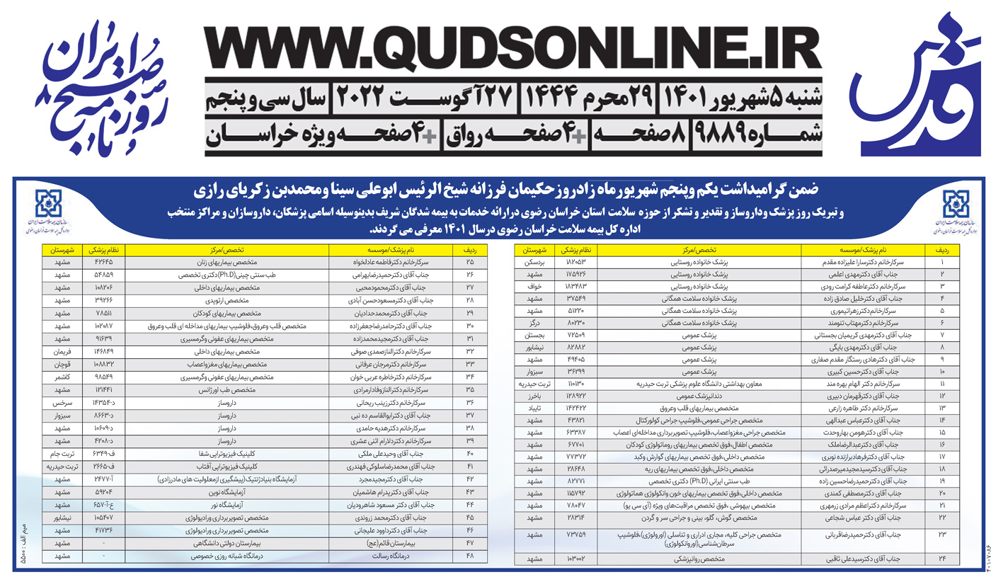 به مناسبت گرامیداشت روز پزشک و داروساز، اداره کل بیمه سلامت استان خراسان رضوی، با درج خبر در روزنامه قدس با شماره ۹۸۸۹ مورخ ۵ شهریور ماه، از فعالین حوزه سلامت و مراکز منتخب به واسطه ارائه خدمات مطلوب به بیمه شدگان سلامت، تقدیر و تجلیل کرد.