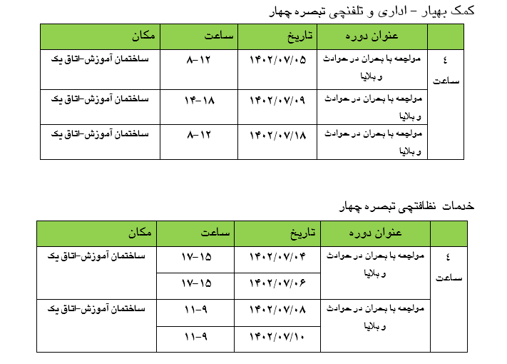 شایسته است کلیه مسئولین محترم بخشها و واحدها به گونه ای برنامه ریزی نمایند تا پرسنل ذینفع در یکی از زمانهای قید شده شرکت نمایند و لیست فراگیران هر دوره را به تفکیک تا تاریخ 25/06/1402 به واحد آموزش ضمن خدمت کارکنان مستقر در طبقه اول اموراداری اتاق 117 تحویل نمایند.