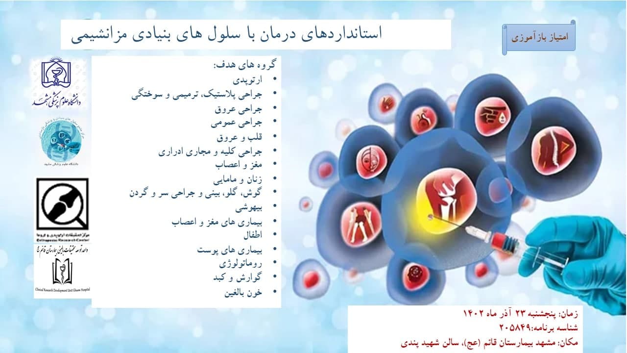 کنفرانس یکروزه استانداردهای درمان با سلول های بنیادی مزانشیمی انسانی، پنجشنبه 23 آذر ساعت 8 صبح تا 13، محل برگزاری سالن شهید پندی، ساختمان کتابخانه، با امتیاز بازآموزی.