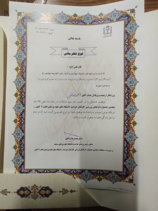 اين ورزشکار جوان، در پنجمين جشنواره مسابقات فرهنگي- ورزشي کارکنان حراست دانشگاه هاي علوم پزشکي قطب 9 کشور موفق شد، در رشته شنا ( 50 متر کرال سينه )، با ثبت رکورد 37 ثانيه، پس از شناگراني از دانشگاه هاي بيرجند و مشهد ( بيمارستان امام رضا (ع)) بر سکوي سوم قهرماني بايستد.