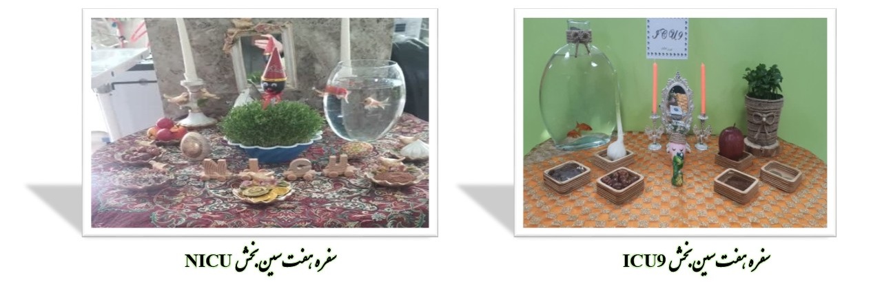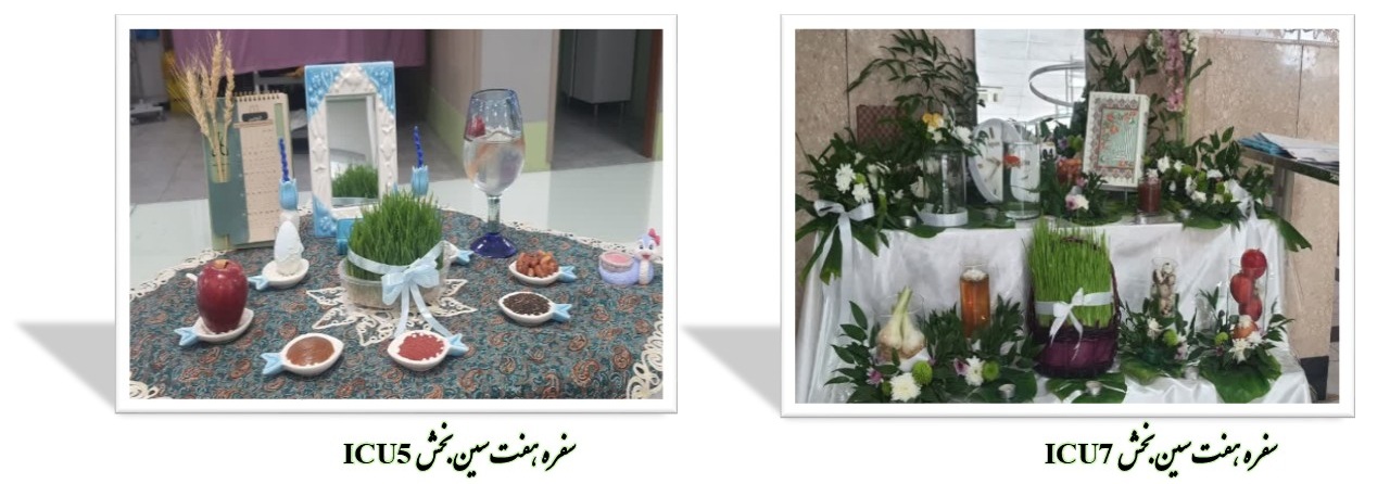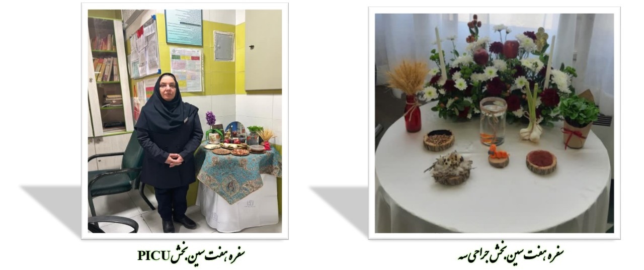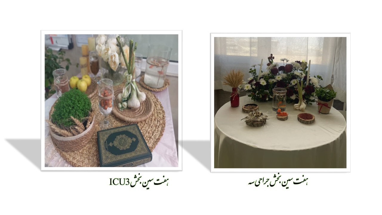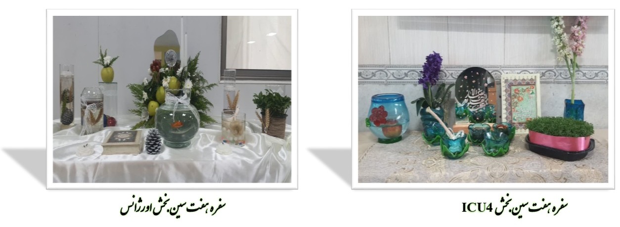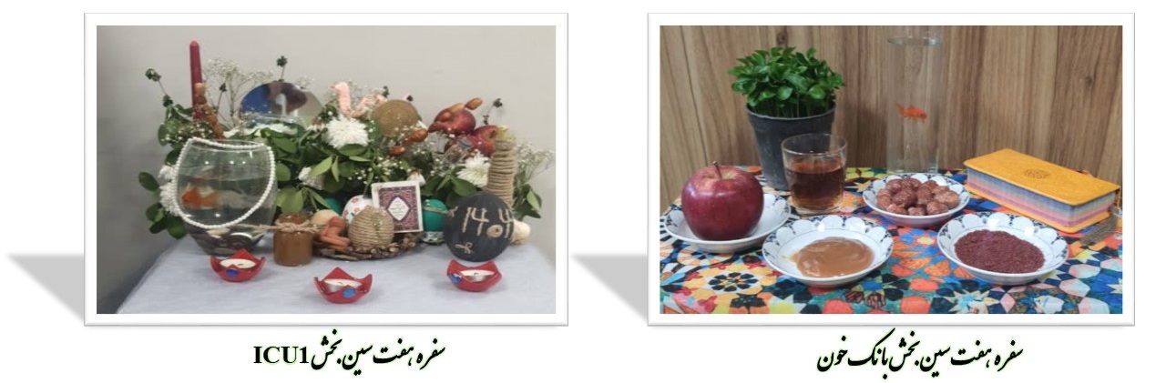 هر یک از بخشهای بیمارستان با خلاقیت و ذوق خاصی سفرههای هفتسین را تزیین کردهاند و هر کدام از این سفرهها پیامهای امیدبخشی مانند سلامتی، شفا و آرامش را به بیماران هدیه میدهند.