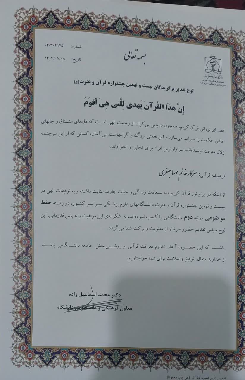 این جشنواره که هر ساله با هدف ترویج فرهنگ قرآن و عترت و شناسایی استعدادهای برتر قرآنی برگزار میشود، میزبان شرکتکنندگان برجستهای از دانشگاهها و مراکز درمانی سراسر کشور است. در این دوره از مسابقات، خانم جعفری با پشتکار، تلاش مستمر و حضور درخشان خود، توانست در میان جمعی از حافظان توانمند کشور بدرخشد و عنوان ارزشمند رتبه دوم را از آنِ خود کند.